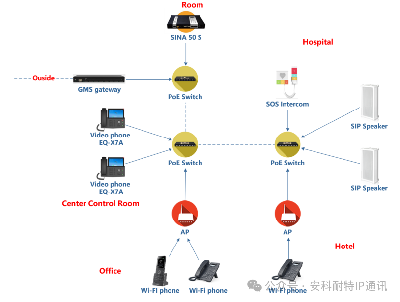 The solution deeply understands and accurately matches the unique communication needs of different functional areas including catering, hotel, office, wellness center, and leisure and entertainment, and selects the most suitable terminal devices. All terminals can seamlessly connect to the SINA core system via the SIP protocol, forming an organic whole and ensuring system compatibility, scalability, and manageability.