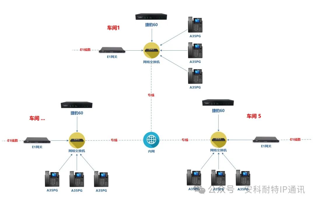 Based on the internal network environment, we implement IP trunking connection for the Jaguar 60 IP Phone Systems of the 5 workshops to ensure free inter-communication between workshops.
